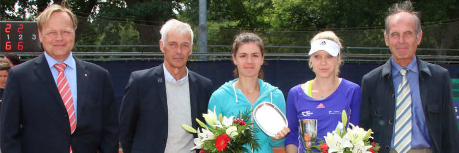 Katharina Hobgarski (Saarbrücken) gewann das Juniorinnenfinale gegen Ioanna Diana Pietroiu aus Rumänien glatt mit 6-2 und 6-2 und fügte ihrer bisher schon erfolgreichen Jugendkarriere einen weiteren eindrucksvollen Erfolg an. Was für ein grandioser Monat für die Saarländerin, die vor drei Wochen die internationalen belgischen Meisterschaften gewann, vor zwei Wochen das Viertelfinale beim Grand Slam Turnier in Paris erreichte, am 18. Juni, also vor drei Tagen, ihren 18. Geburtstag feierte und heute bei den „internationalen Deutschen“ siegte. So kann es weitergehen! (Auf dem Foto von links: Werner Ellerkmann, Klaus Eberhard, Ioana Diana Pietroiu, Katharina Hobgarski und Dr. Klaus-Peter Walter)